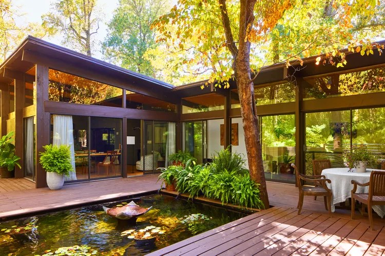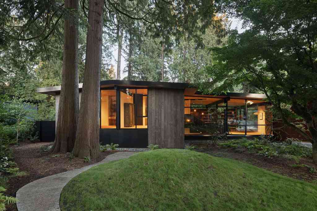 Key Features: Flat or low-sloped roofs, large glass windows, open floor plans, integration with nature