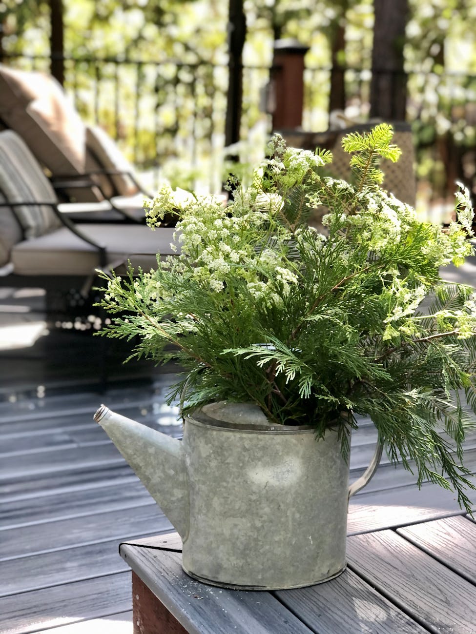An antique-inspired watering can brings vintage charm while still being useful for your spring planting. Display it on porch steps or next to your rockers with fresh tulips or wildflowers tucked inside for a sweet seasonal statement.