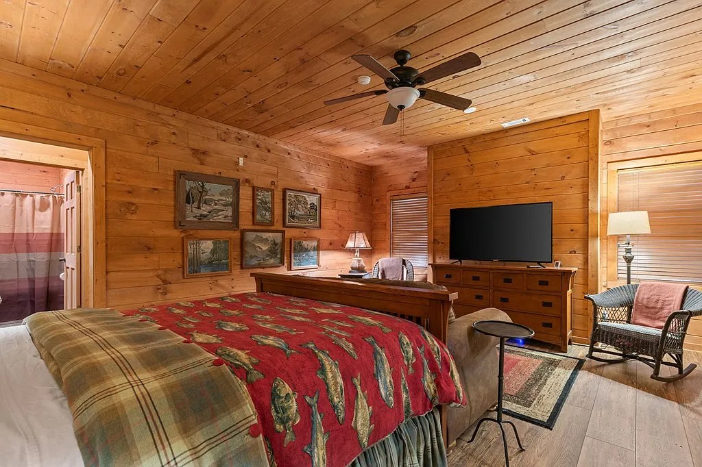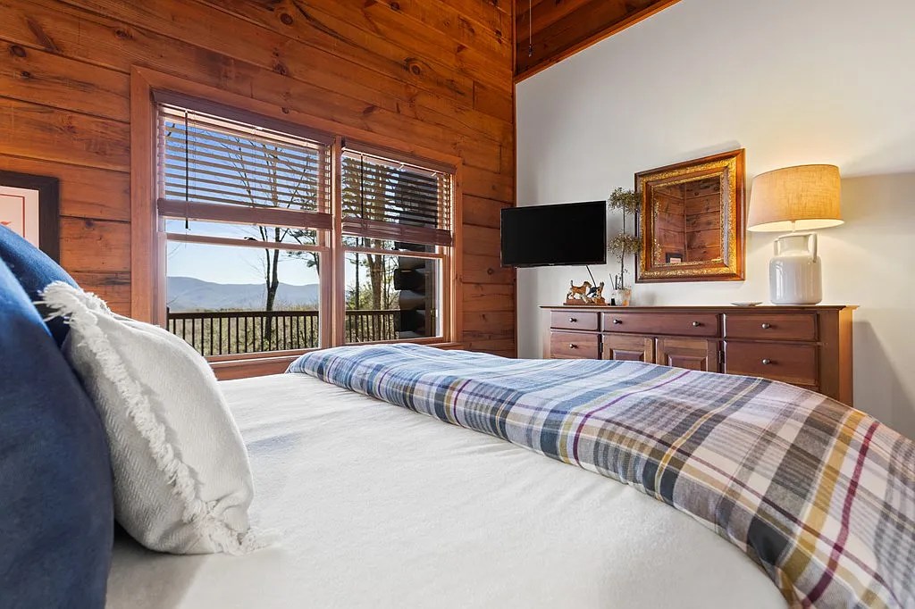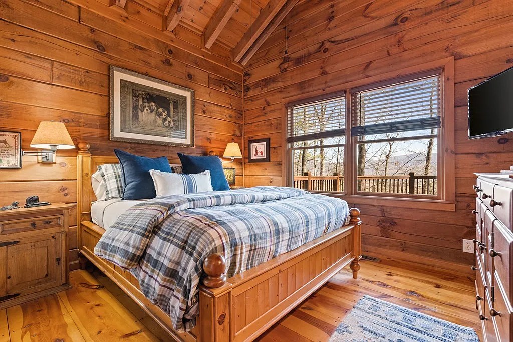 That feeling doesn’t go away. It follows you through every space in this cabin—whether you’re curled up with a blanket on the porch or soaking in the view from the living room.