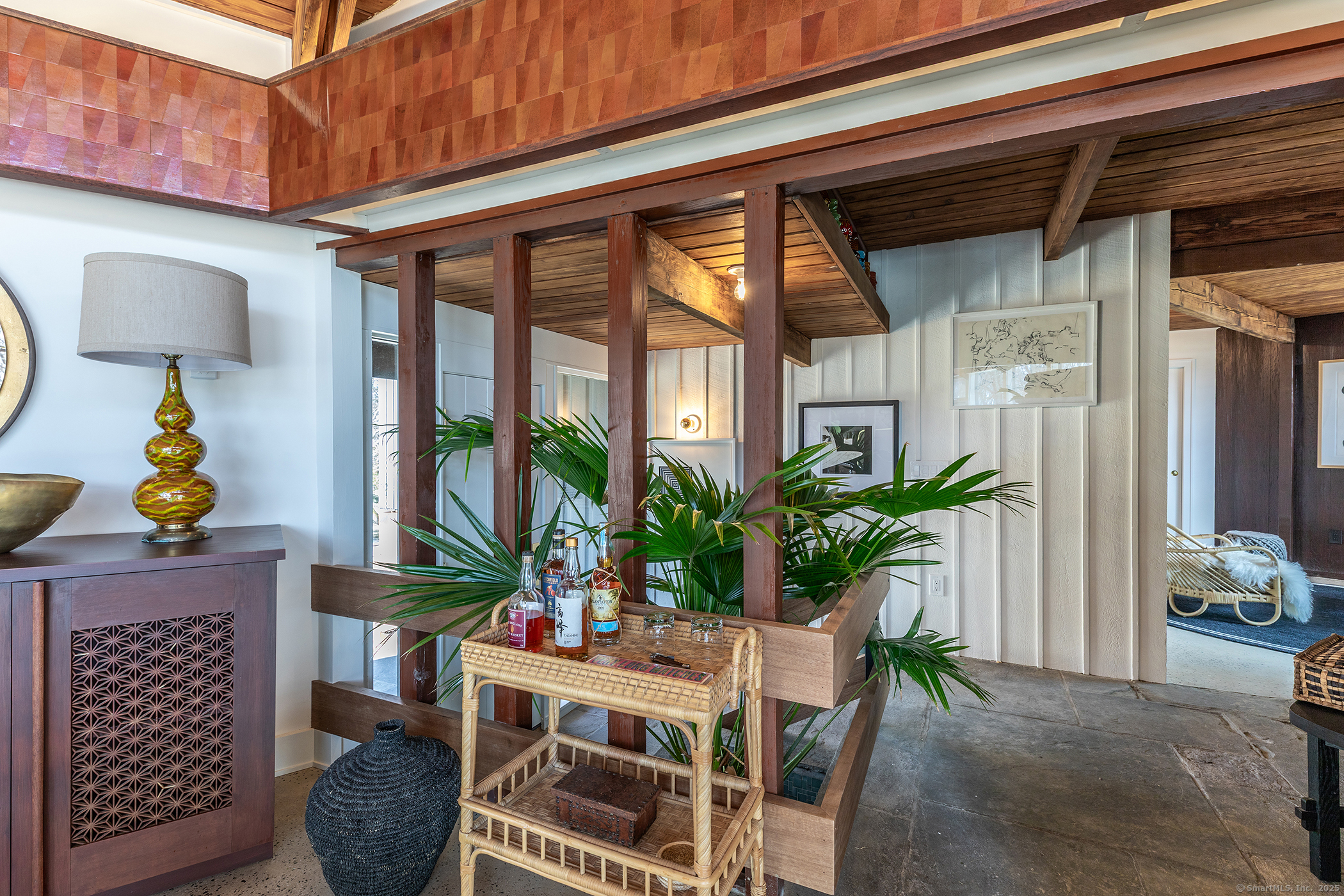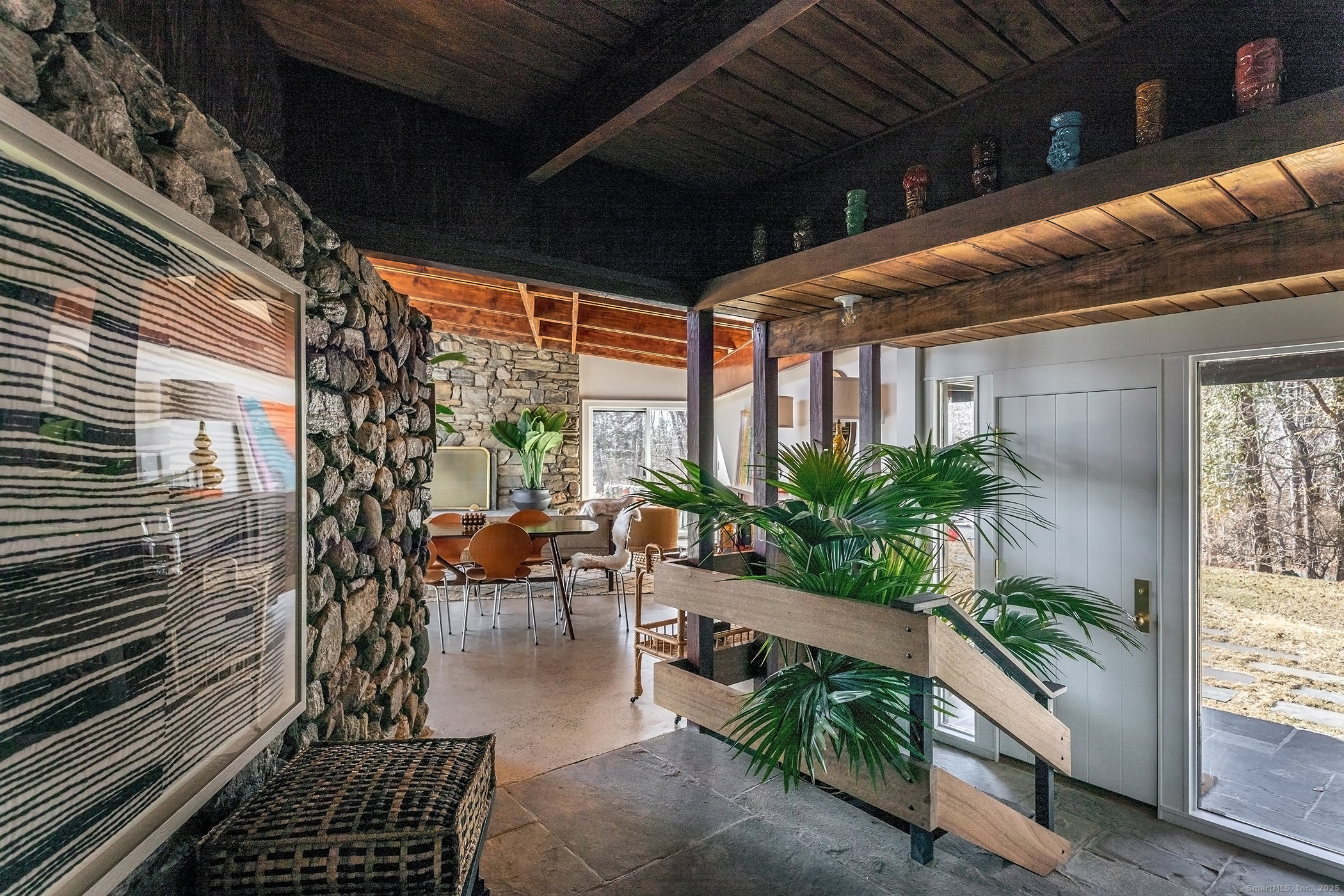 Step through the custom bluestone slate entryway, and you’re greeted by something special—a raised landing just a few steps up, framed by a dramatic wall of natural fieldstone. This moment sets the tone: solid, textural, a little unexpected. The angled exposed beams above stretch across the ceiling like sculpture, drawing your eyes upward and outward toward the clerestory windows that flood the home with natural light.