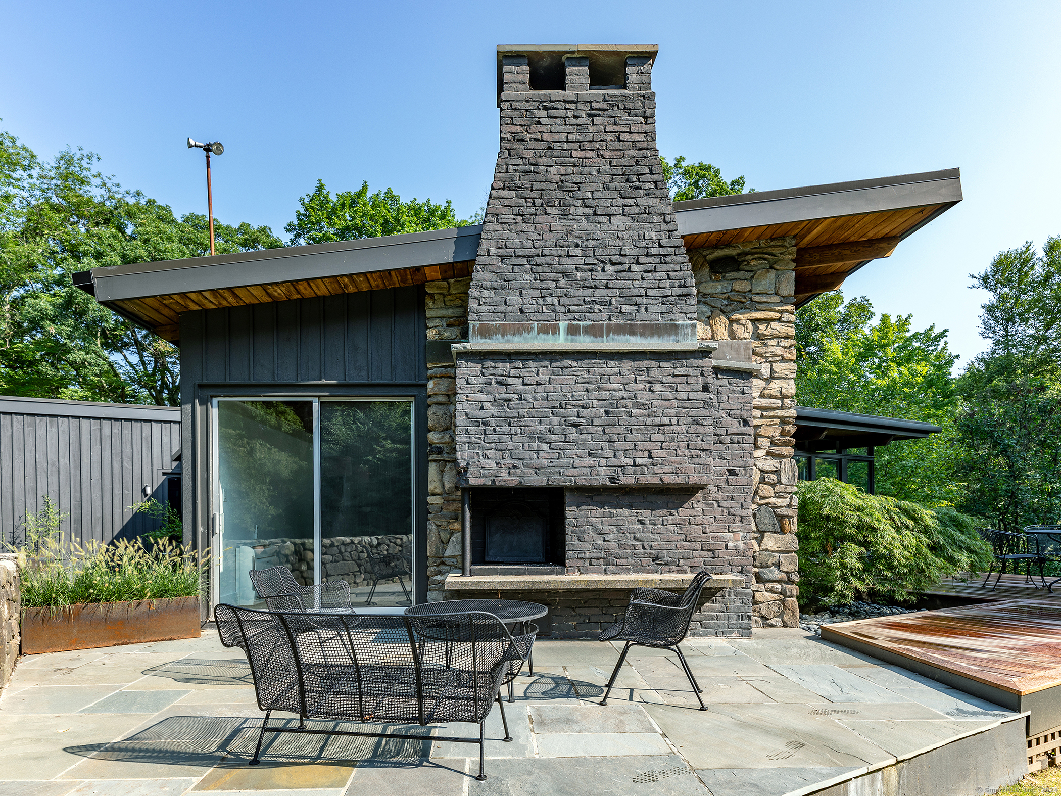 Step outside and the atmosphere shifts again. The bluestone patio wraps around an outdoor fireplace—a perfect spot for gathering in every season. The surrounding 2.71 acres offer room to roam, garden, explore, or simply be.