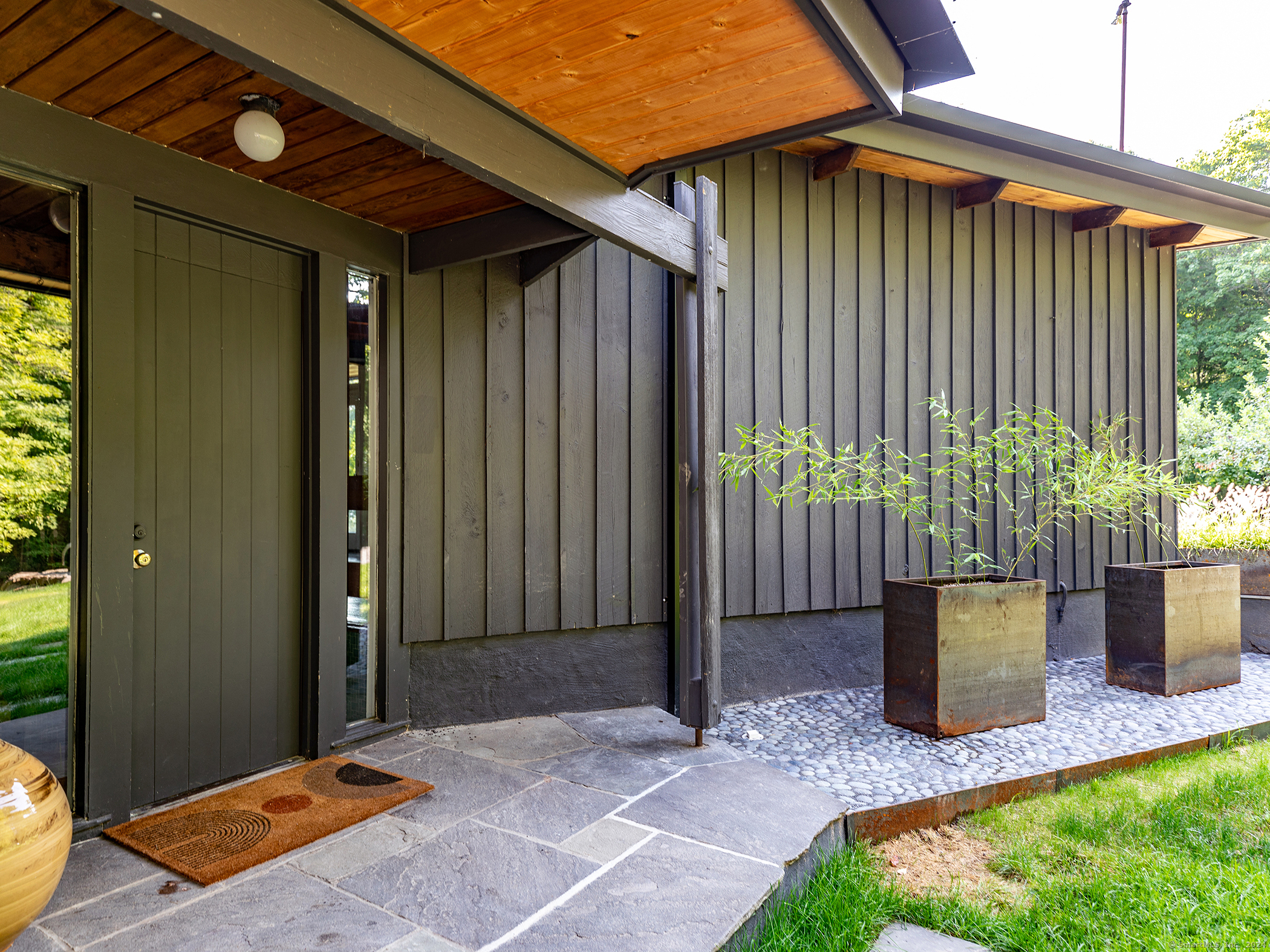 This house leans into one of our favorite mid-century modern signatures: material contrast. From the smooth bluestone slate underfoot to the warmth of wood-paneled and board-and-batten walls, the tactile layers give each room a distinct personality.