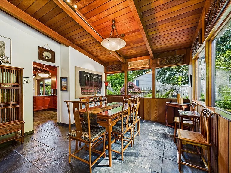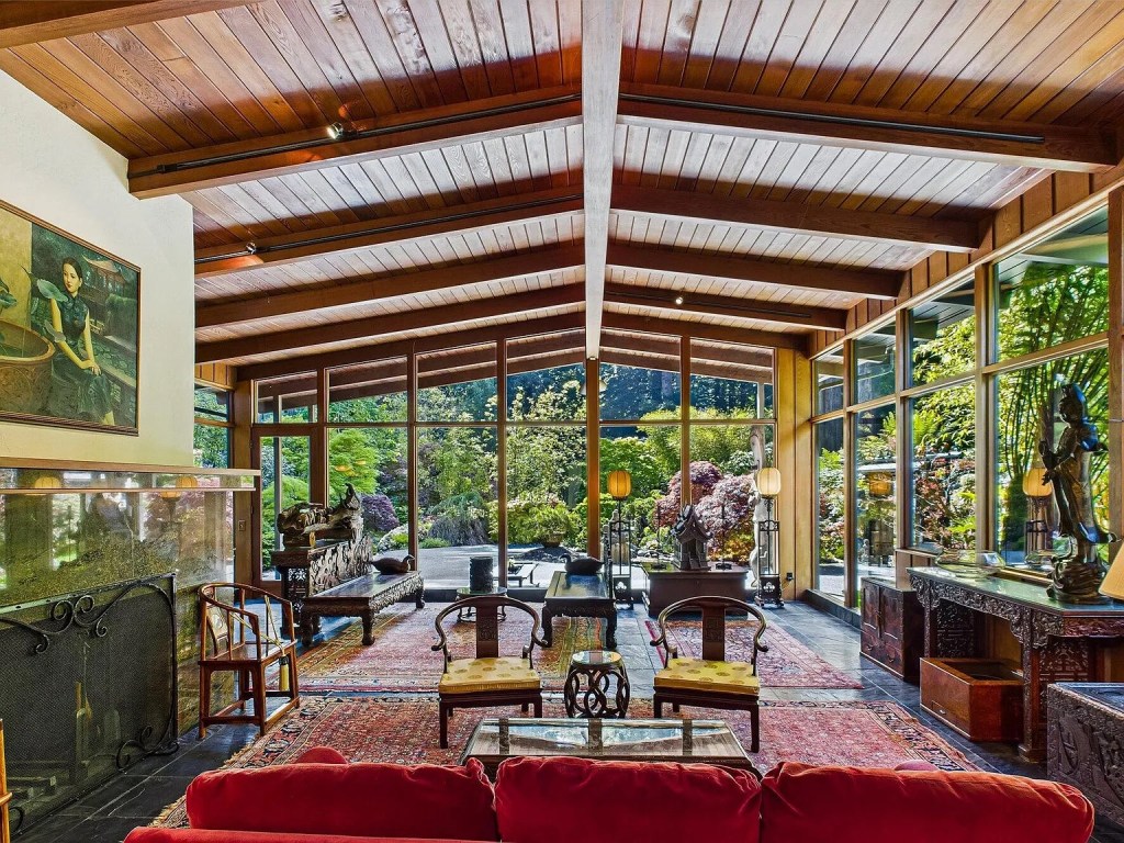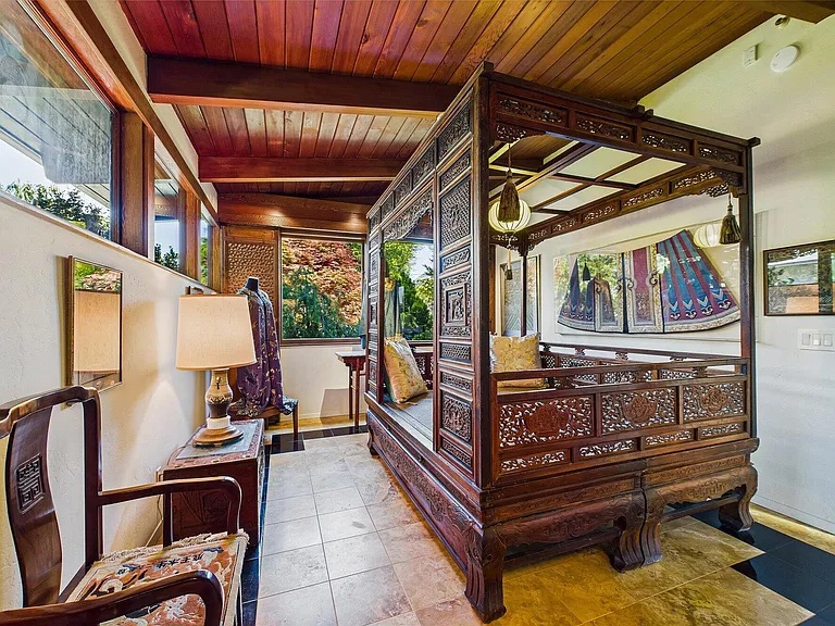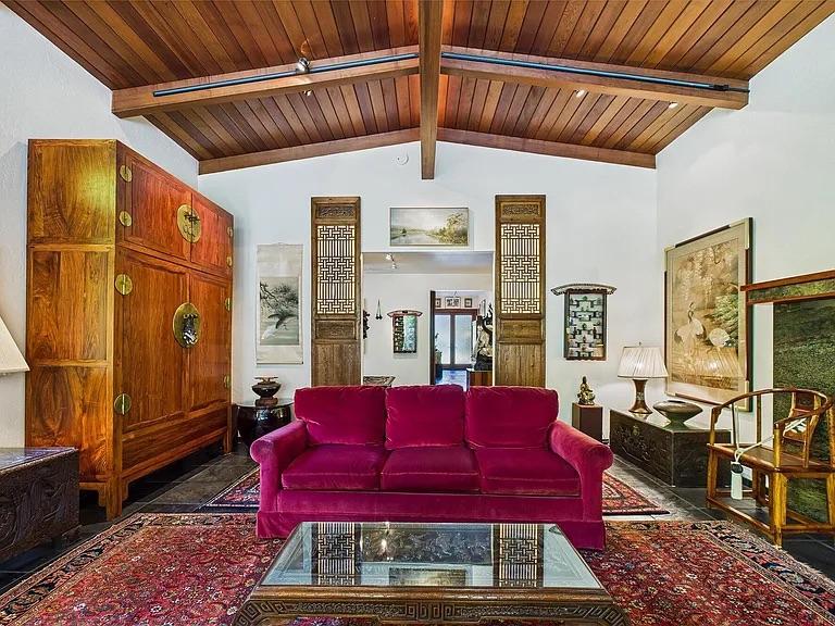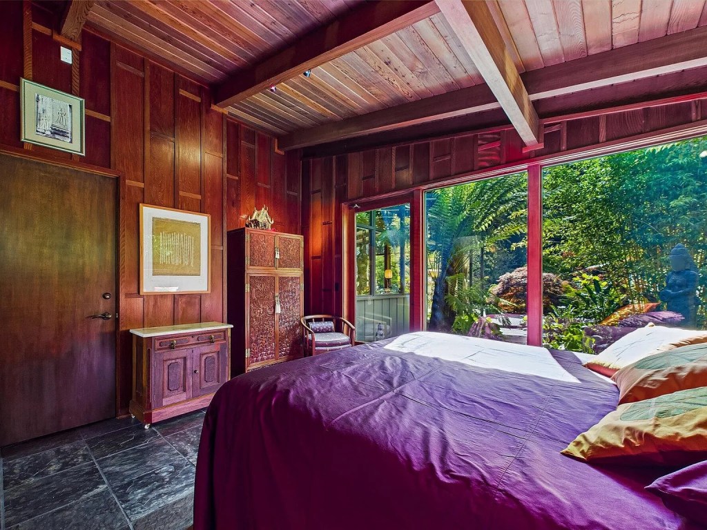 Built in the 1960s using old-growth redwood, this 3,300 sq. ft. home exemplifies the mid-century modern ethos: clean lines, functional spaces, and a harmonious relationship with nature. What sets it apart is the infusion of Japanese and Chinese design elements—think sliding wooden doors with intricate carvings, dragon-shaped door handles, and expansive windows that frame the lush gardens like living art.