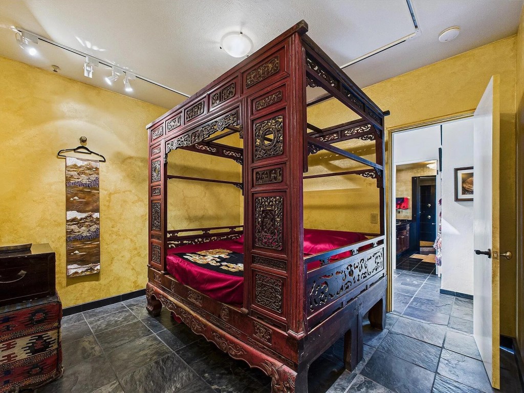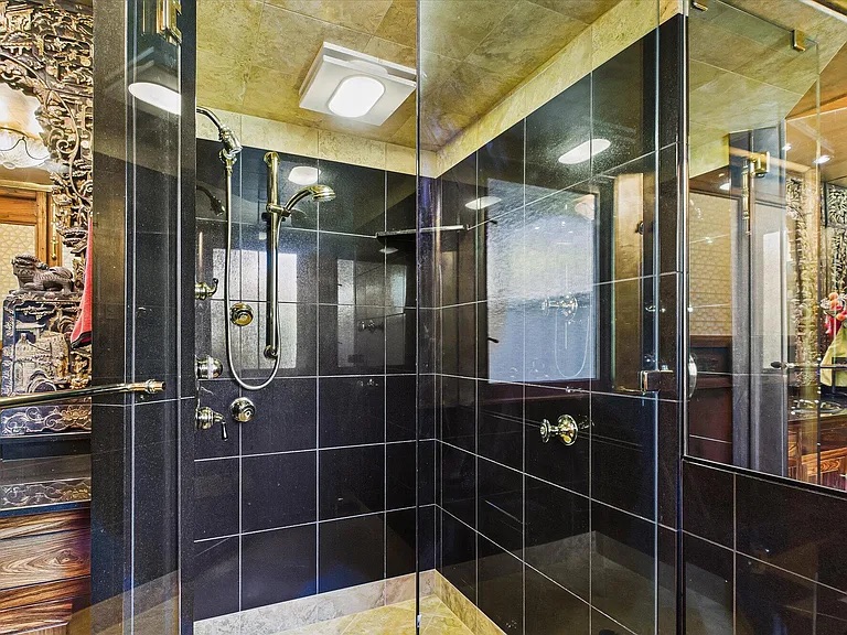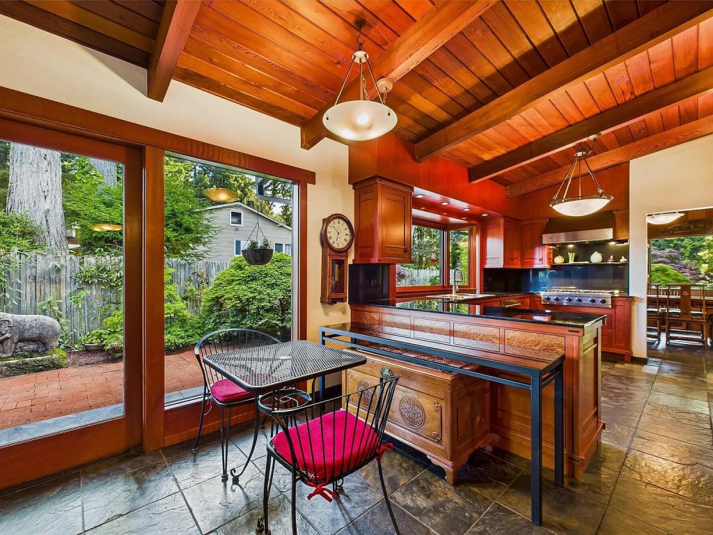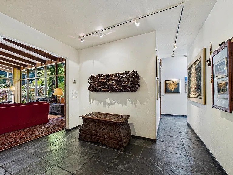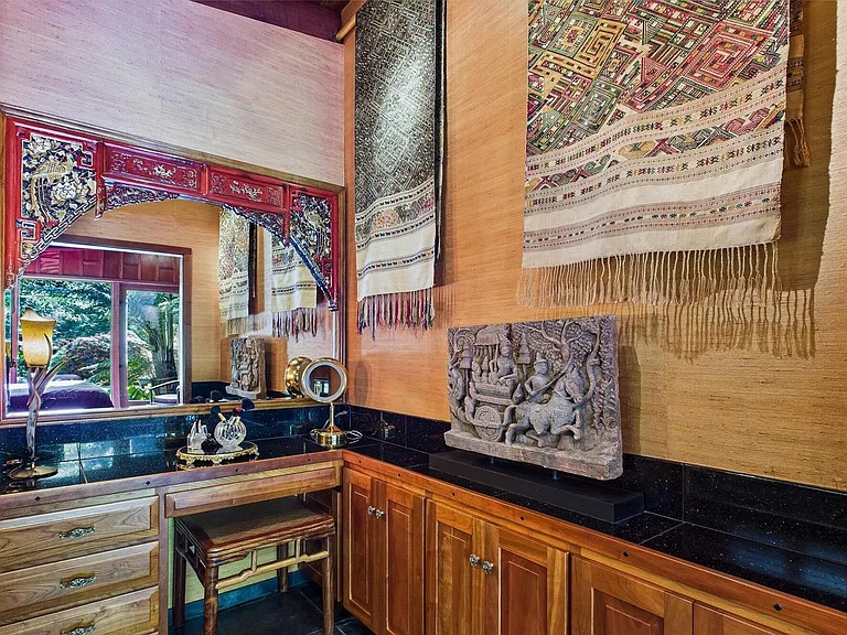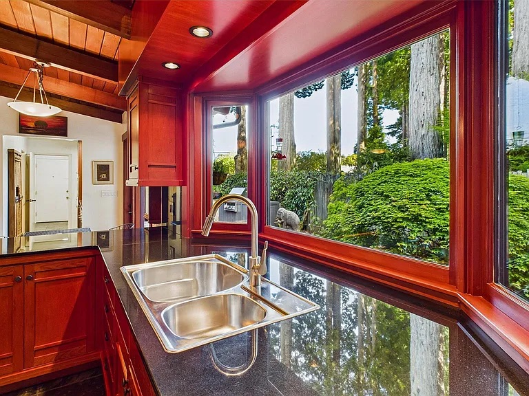 Built in the 1960s using old-growth redwood, this 3,300 sq. ft. home exemplifies the mid-century modern ethos: clean lines, functional spaces, and a harmonious relationship with nature. What sets it apart is the infusion of Japanese and Chinese design elements—think sliding wooden doors with intricate carvings, dragon-shaped door handles, and expansive windows that frame the lush gardens like living art.