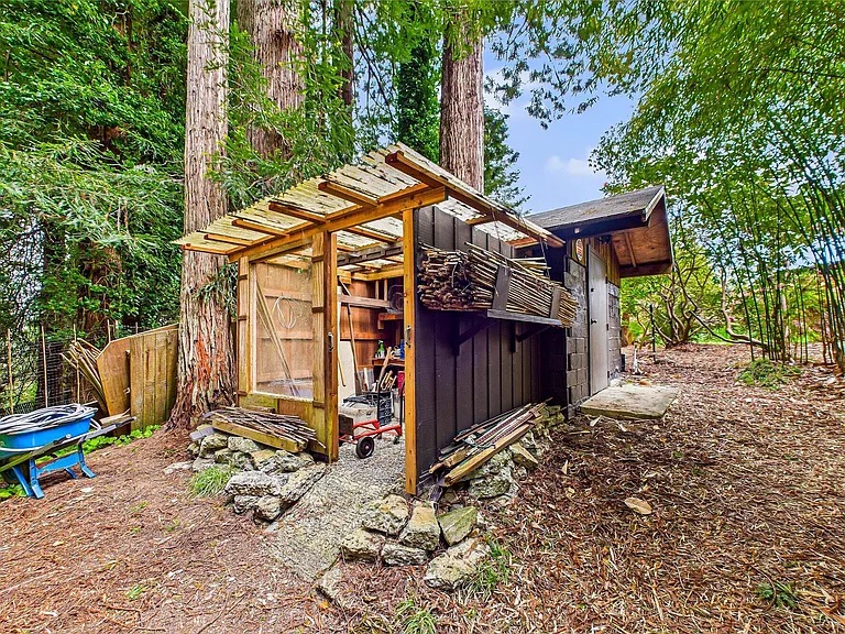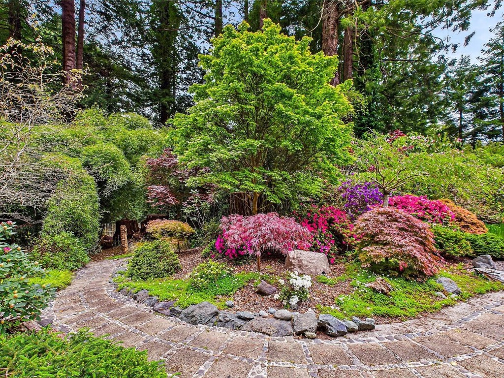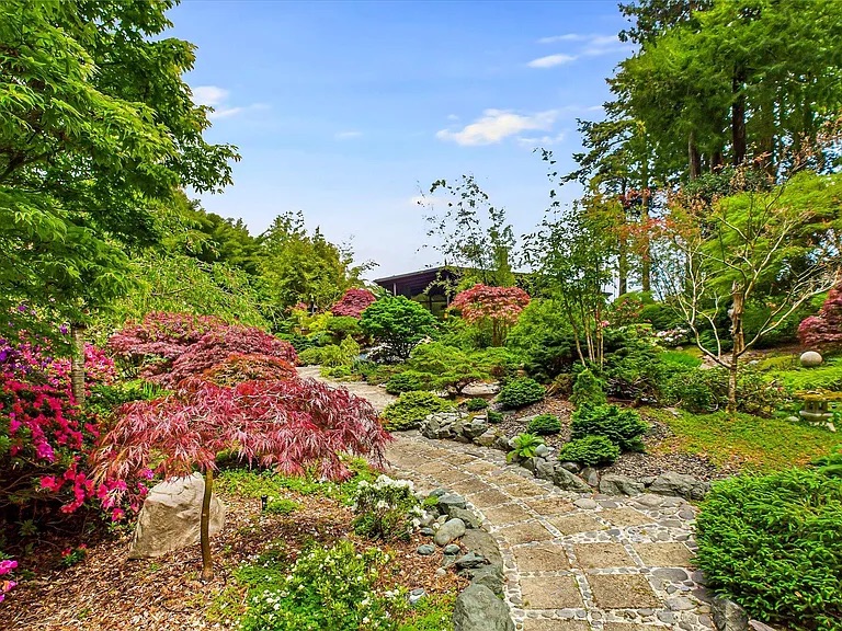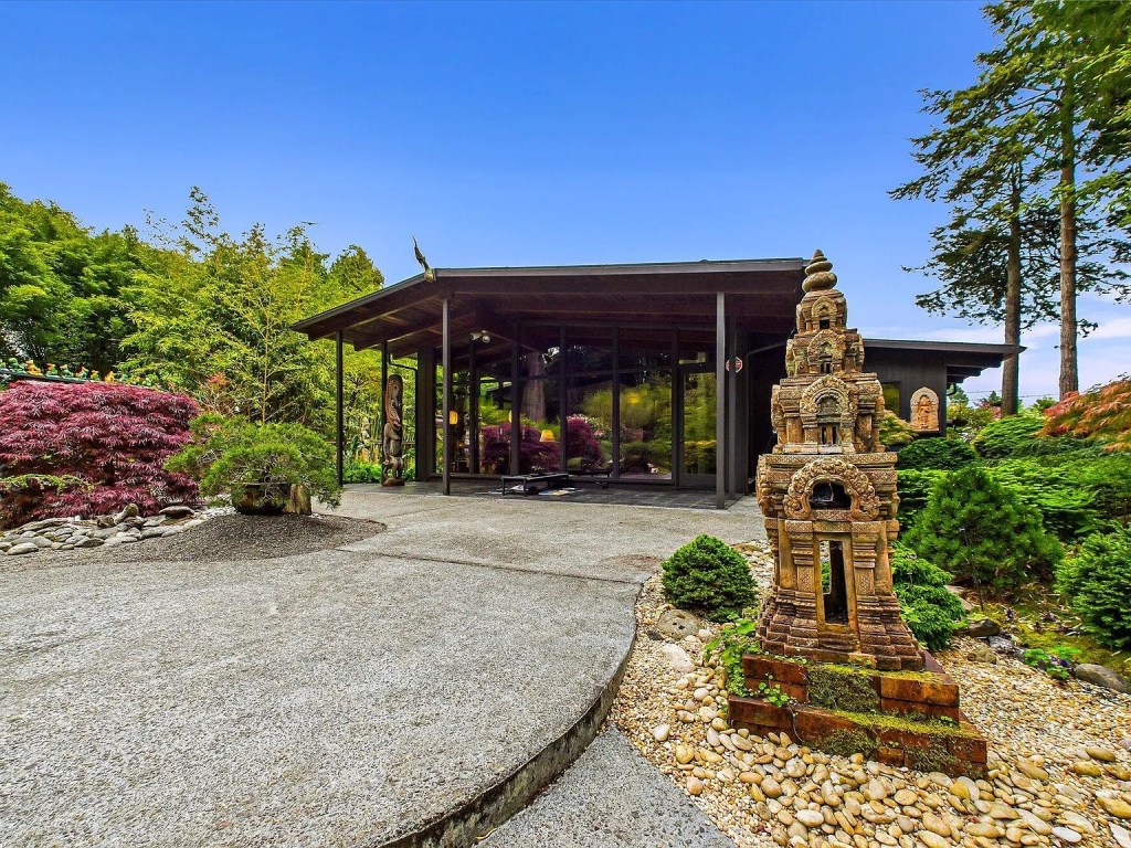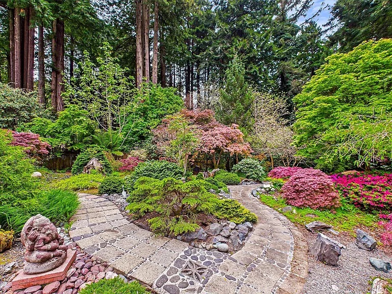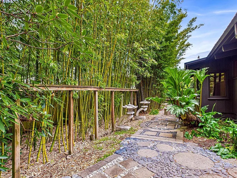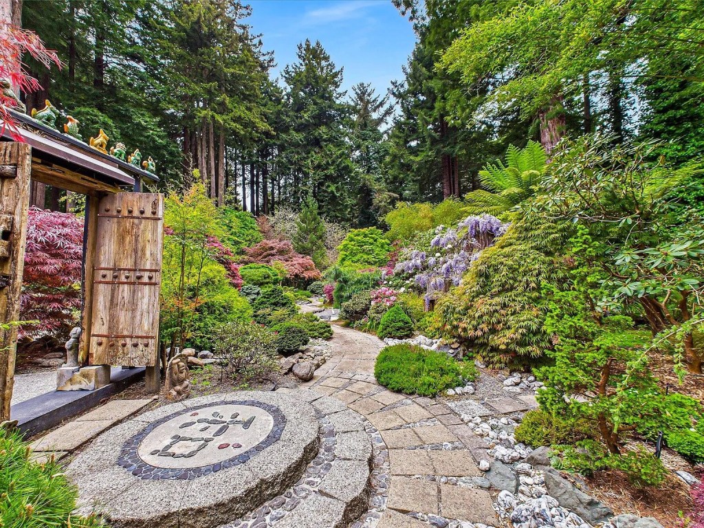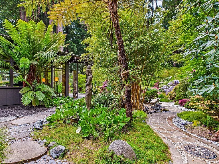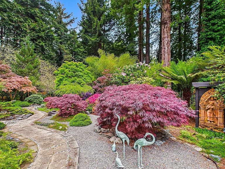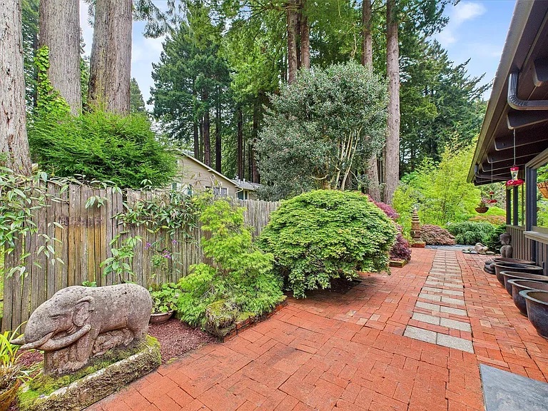 As a lover of outdoor spaces, the gardens are where this home truly speaks to me. Inspired by Cambodian, Thai, Indonesian, Japanese, and Chinese landscapes, the half-acre property features stone carvings, bamboo, miniature conifers, rhododendrons, ornamental grasses, Japanese maples, a dry rock stream, and majestic redwoods. A detached wine cellar and a partially covered patio complete this serene retreat.