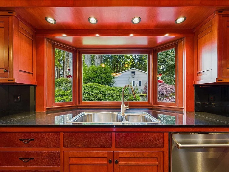 The chef’s kitchen is a dream, featuring Sub-Zero, Viking, and Dacor appliances, granite countertops, and custom cherry and redwood burl cabinets. A large bay window above the sink offers a tranquil view of the meticulously designed gardens, making everyday tasks feel like a meditative experience.