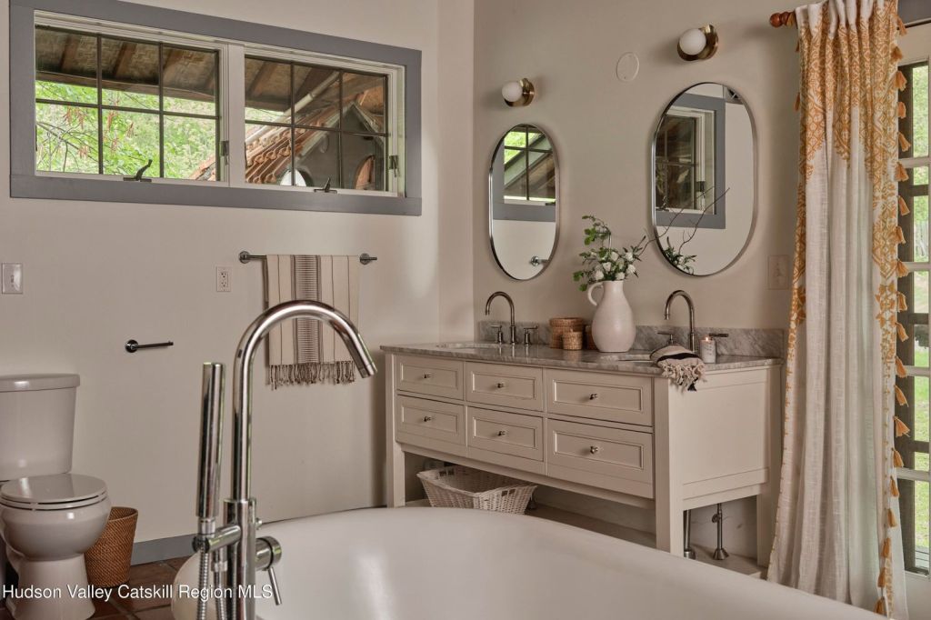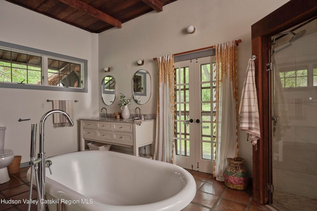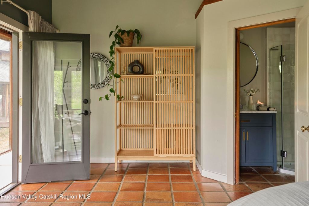 The home features two bedrooms and two full bathrooms, thoughtfully laid out to balance privacy with flow. In the primary suite, a bathtub sits beside a fireplace—a detail so luxurious and so cozy it feels like something out of a dream. Radiant heated floors, rich natural textures, and an open-concept kitchen ensure the home is not only beautiful but entirely livable, even through chilly Hudson Valley winters.
