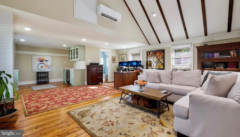 The property also boasts a converted barn, now a multi-functional space featuring a finished second floor with a kitchenette and full bathroom. With its exposed wood beams and random-width flooring, the barn preserves its rustic charm while offering the comforts of a modern guest suite, home office, or creative retreat.