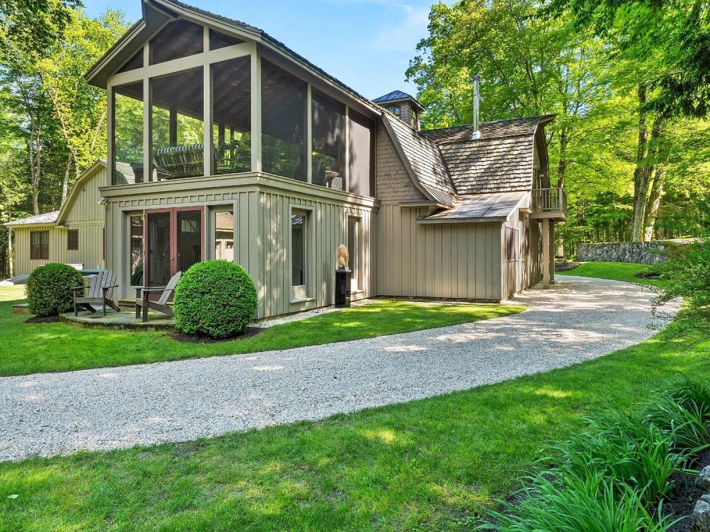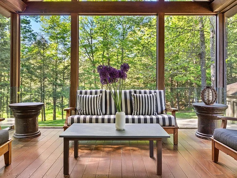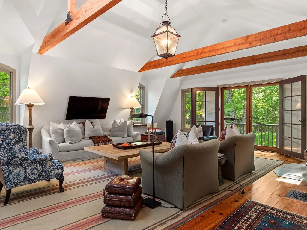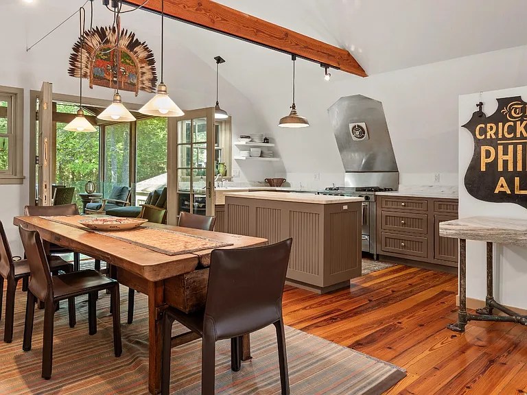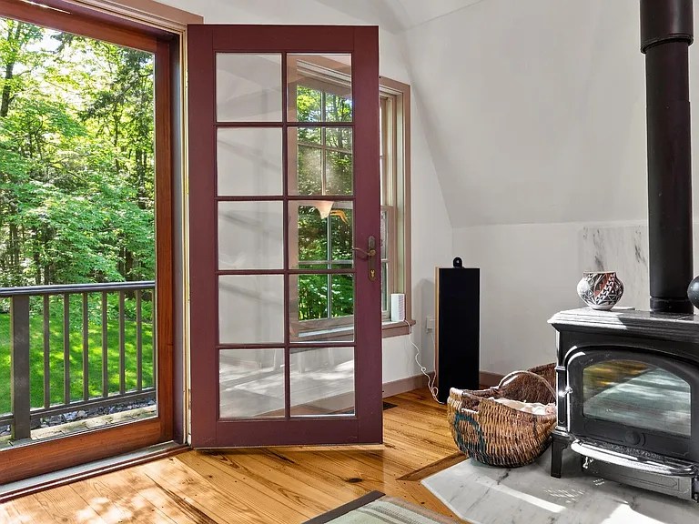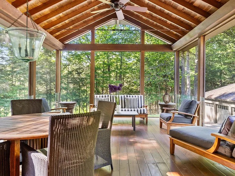 The Great Room has tall vaulted ceilings, exposed beams, and a wood stove—nothing overdone, but it feels intentional. French doors open up to a huge screened porch that’s elevated off the ground and surrounded by trees. It’s the kind of porch you’d actually use—big enough for a long table, a few chairs, and room to breathe.