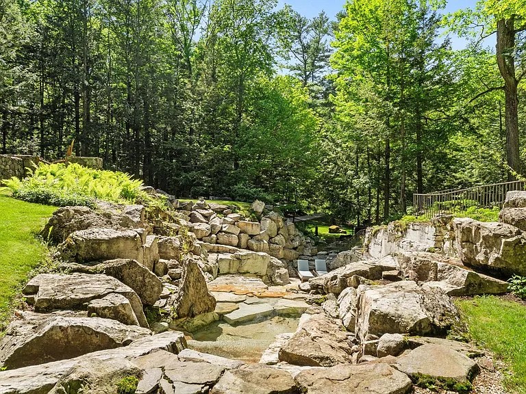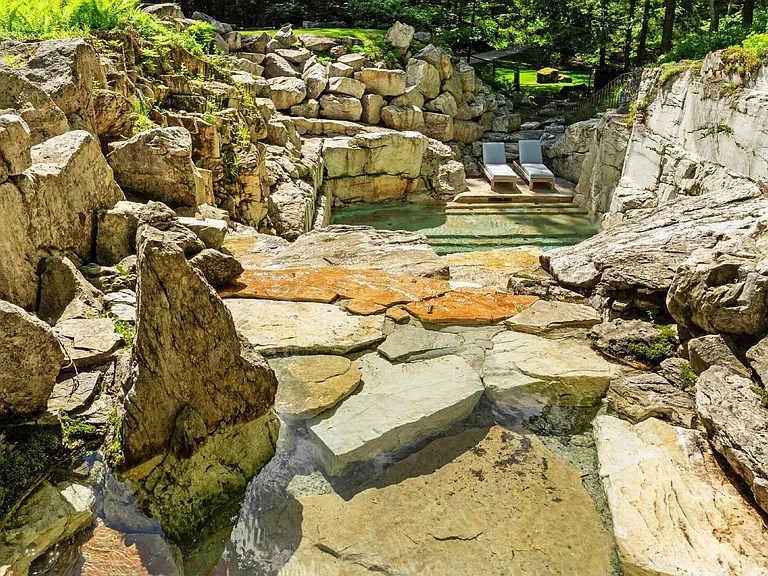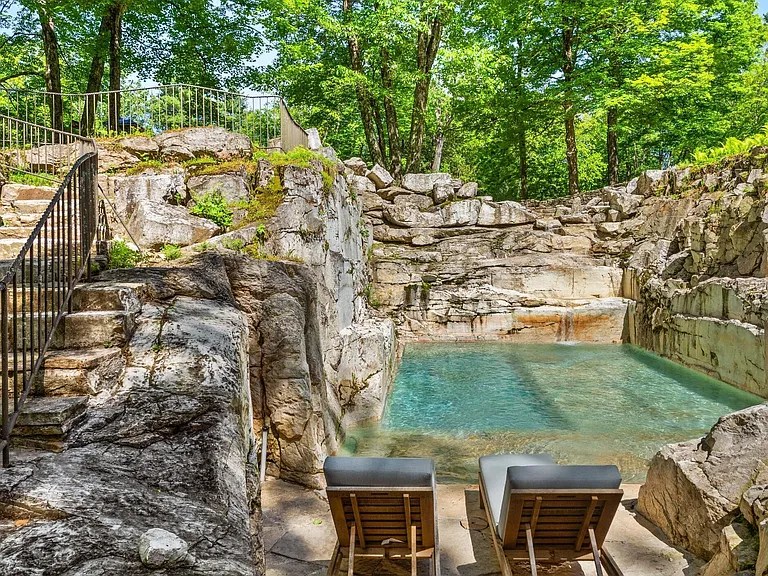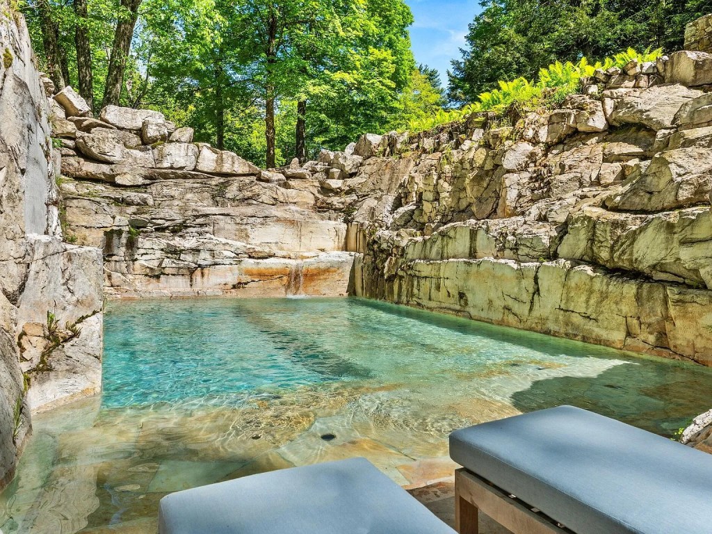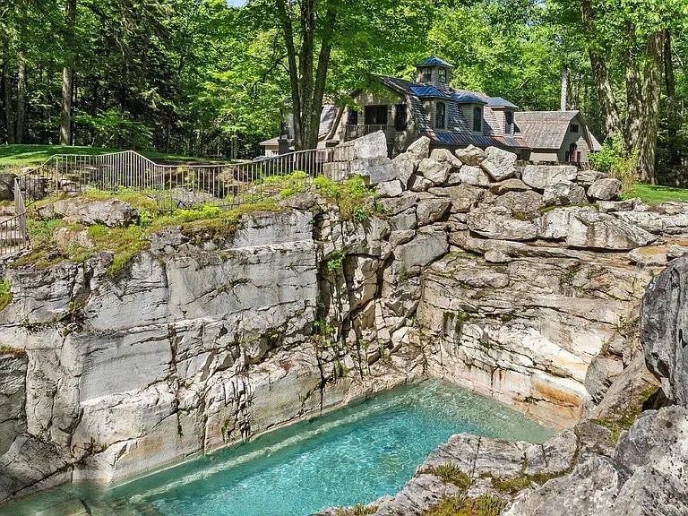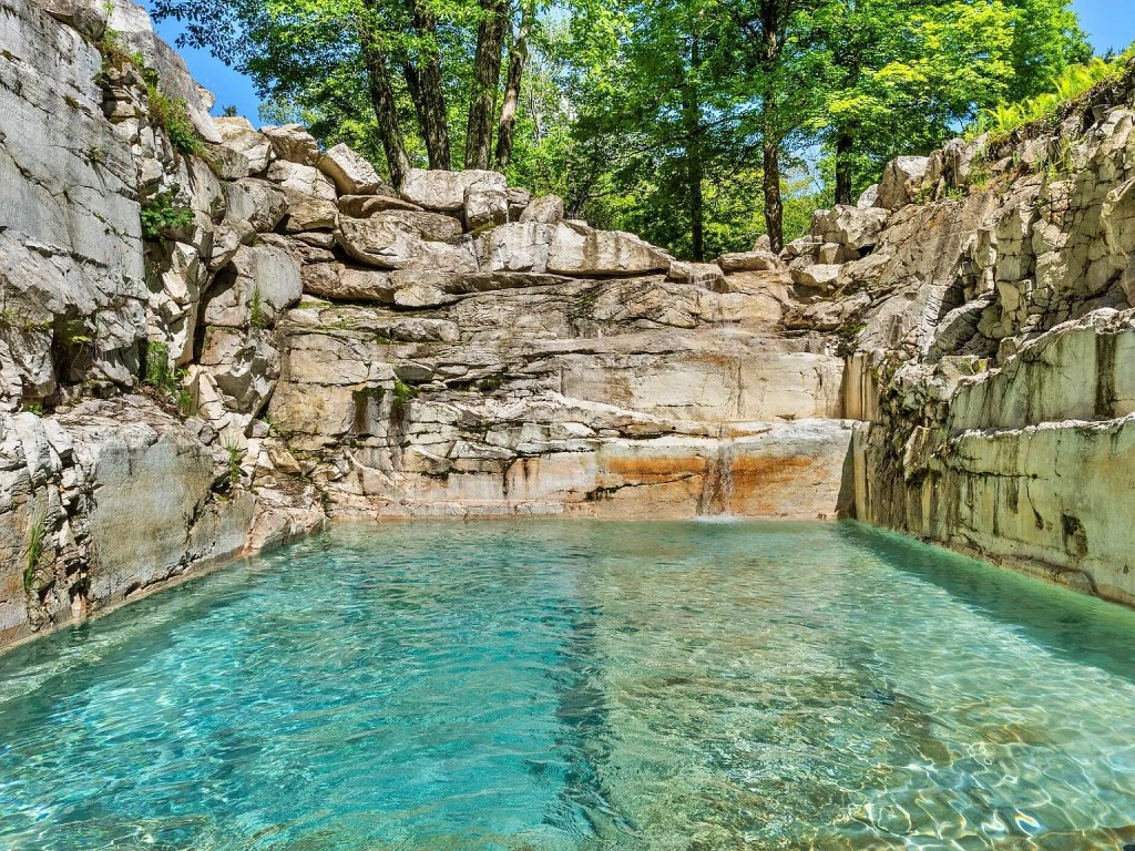 There are unique homes—and then there’s this place. Located in my hometown of Sheffield, Massachusetts, this 60-acre property is built around a limestone quarry that’s been turned into a private pool. It’s not a gimmick. It’s carved right into the land and framed by stone walls and a waterfall. And it’s just five minutes from both public and private schools, with Great Barrington up the road.