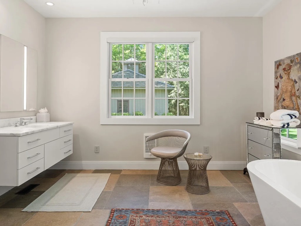 On the first floor, there’s a primary suite with its own sitting area and a spa-style bathroom. It opens right up to the outdoors, so again, the inside and outside are always connected.