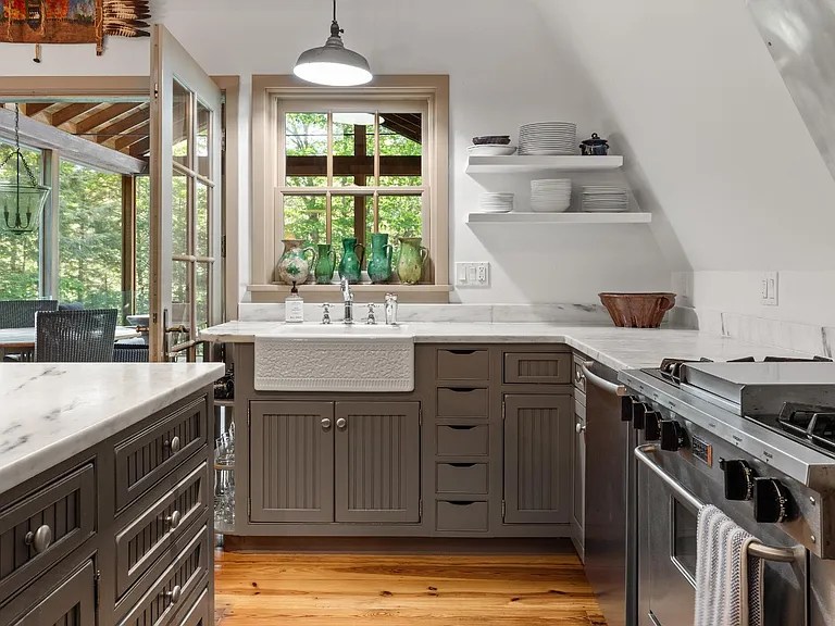 The kitchen is solid. Marble countertops, a farmhouse sink with a detailed apron front (a small thing, but it stands out), and custom cabinets that don’t feel cookie-cutter. It flows right into the dining area so the whole setup feels open without being cavernous.