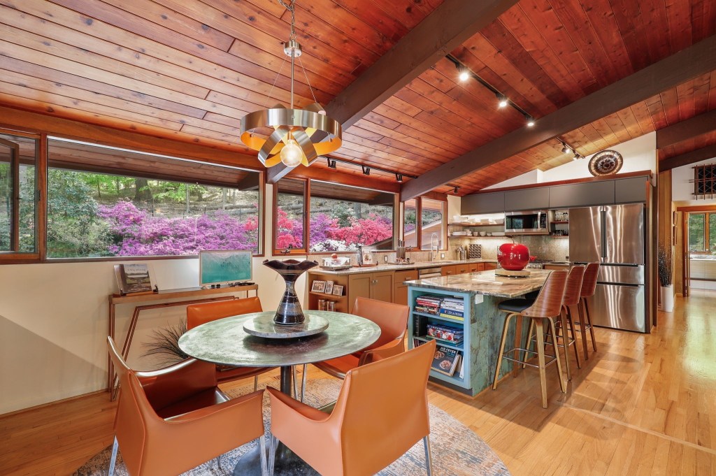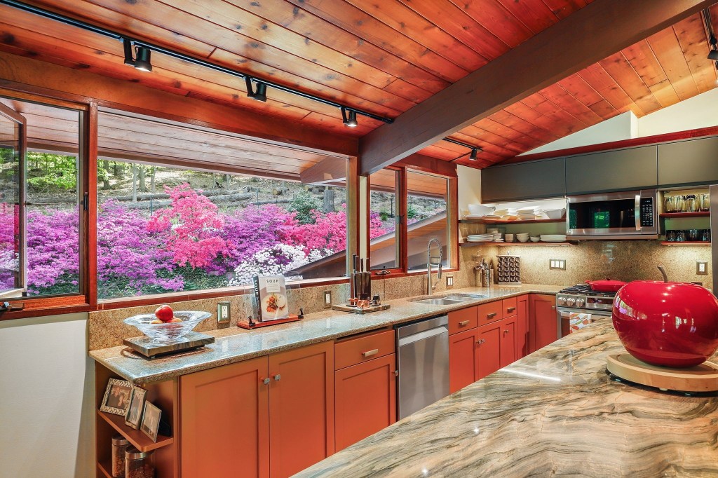 The kitchen sits just off the dining area and has been thoughtfully updated. The granite countertops, stainless appliances, and Sub-Zero fridge give it a luxury feel, but it’s not over-designed. There’s a built-in coffee and cocktail station, an eat-in breakfast area, and sliding doors that lead directly out to the deck. You’ve got multiple access points to outdoor dining, a grill setup, and terraced garden zones. Whether you’re hosting a fall dinner party or sipping coffee solo on a spring morning, it works.