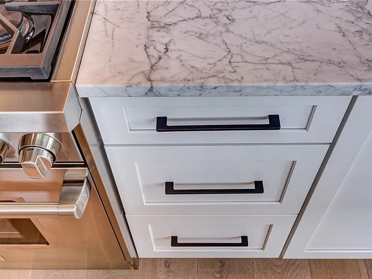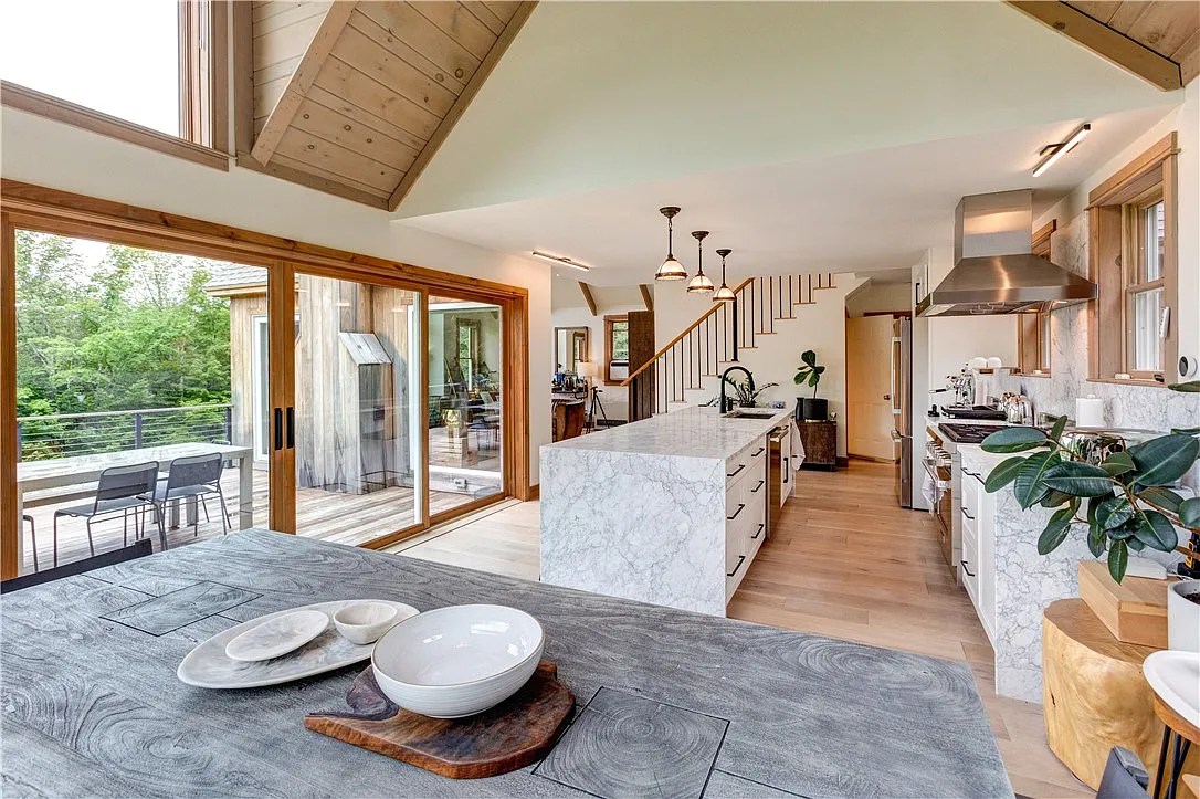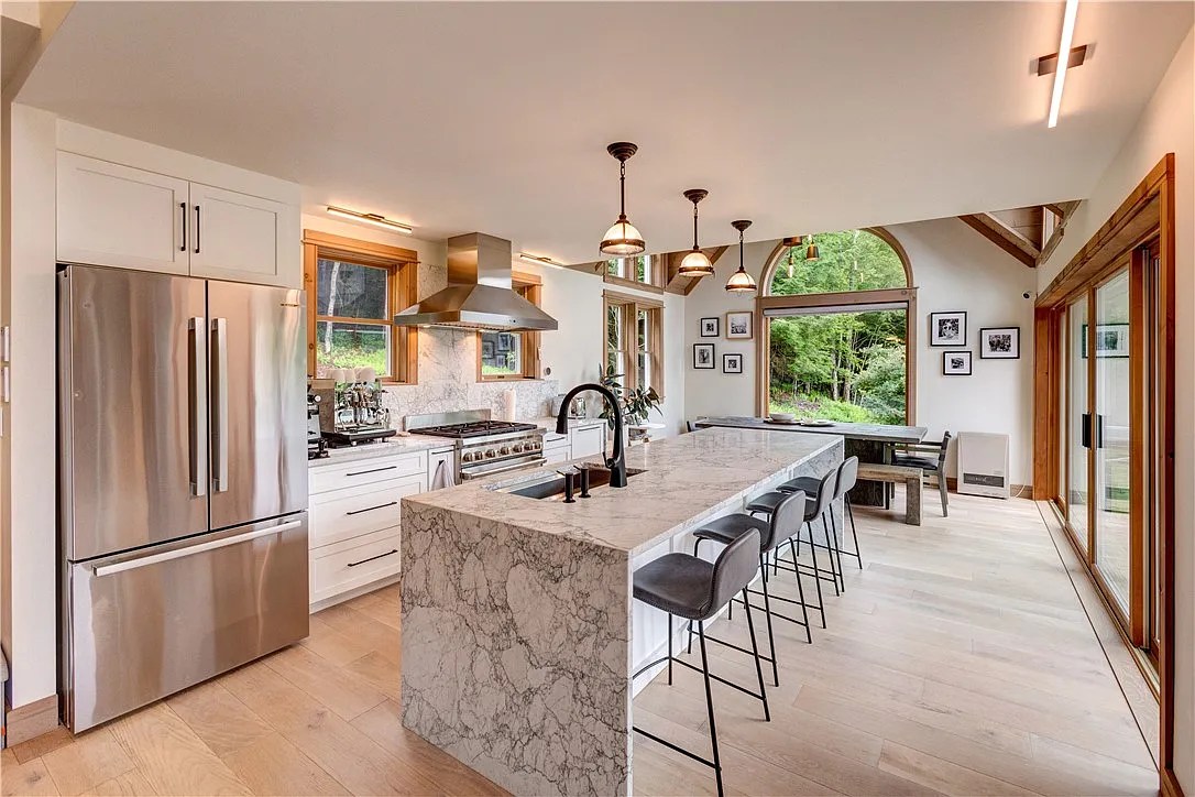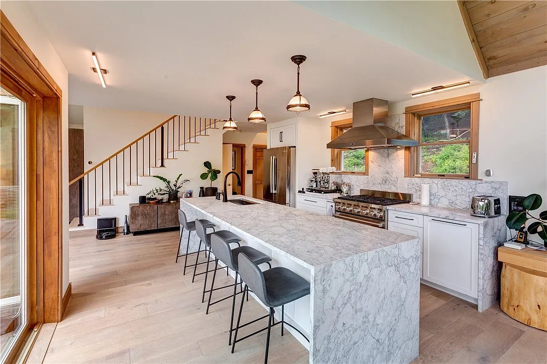At the heart of the home is a striking gourmet kitchen, where imported Calacatta Italian marble countertops add quiet luxury. Custom cabinetry, high-end appliances, and seamless access to the outdoor deck reflect a layout designed for both daily life and easy entertaining.