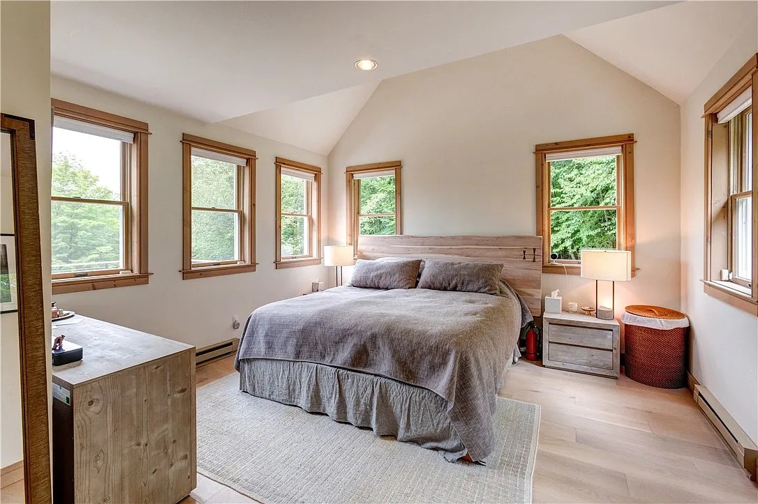 The home opens into a large, open-concept living area where cathedral ceilings and oversized windows frame the wooded landscape outside. This architectural choice isn’t just for aesthetics, it allows the interior to be flooded with natural light while maintaining a cozy, grounded feeling inside.