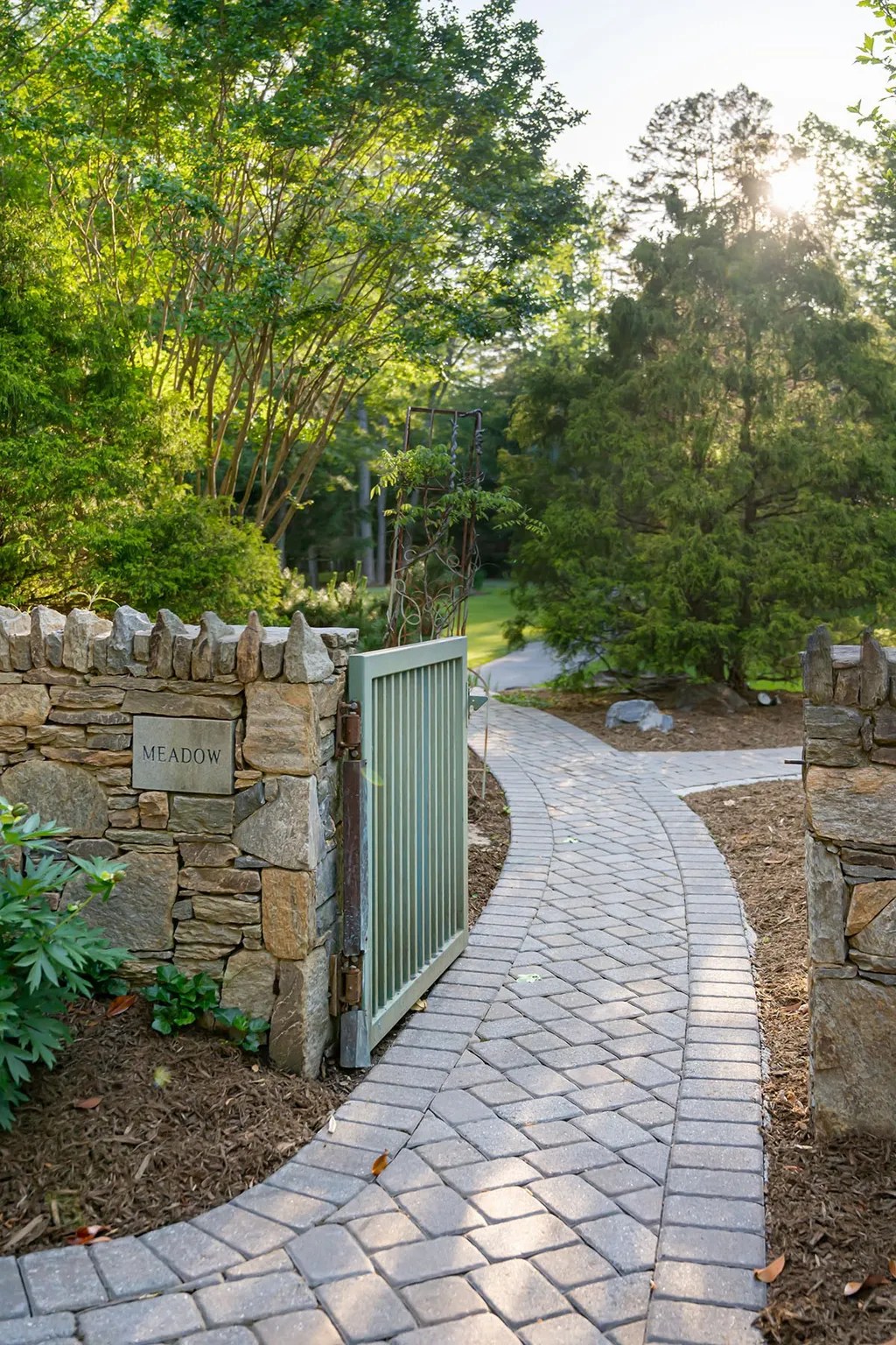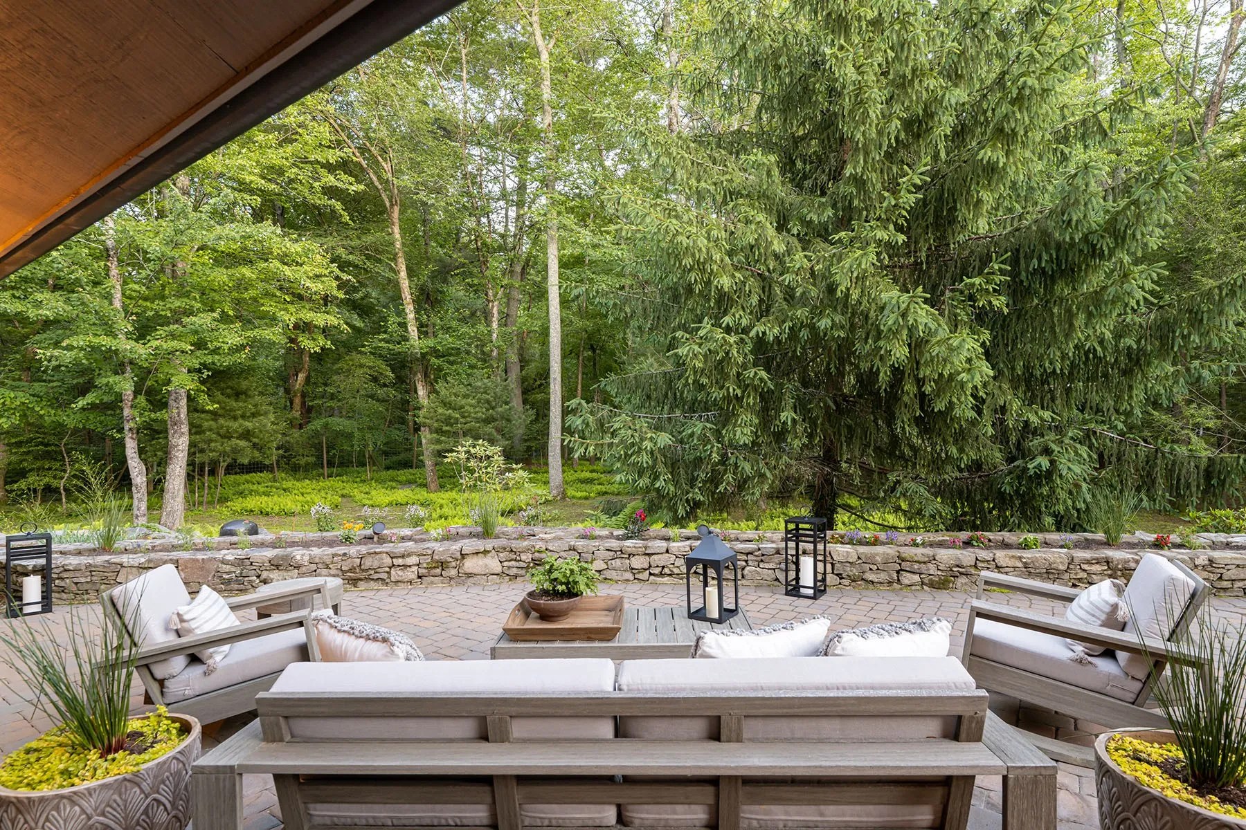 Step outside and you’ll find curated gardens, open meadows, and a storybook-style conservancy that make the four-acre property feel even larger. Towering trees and a stunning stone wall border the property, providing both visual drama and privacy.