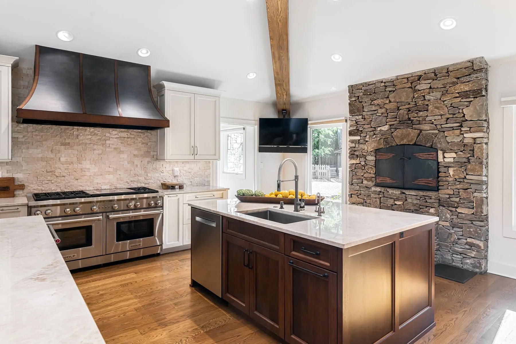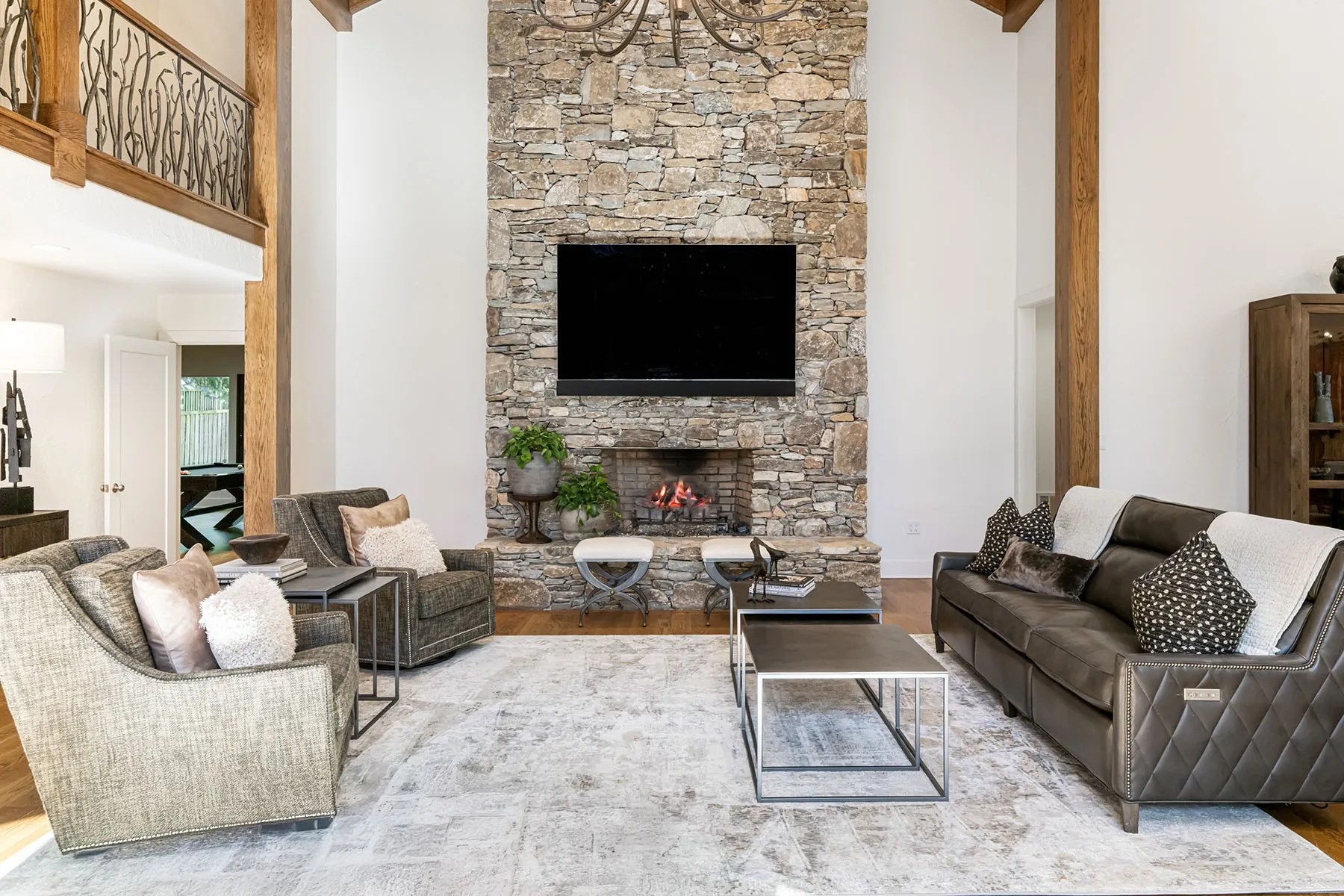 - A dramatic living room with floor-to-ceiling stone fireplace