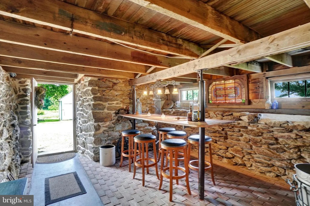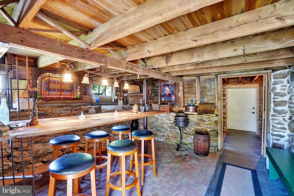 The exterior structures offer architectural interest all their own. A three-story “Summer House” with a massive brick fireplace offers rustic retreat potential, though it will need restoration to reach its full charm. Below that, the original stone-walled basement with a brick floor and built-in bar reveals how this property was built for more than just function, it was made to host and gather.