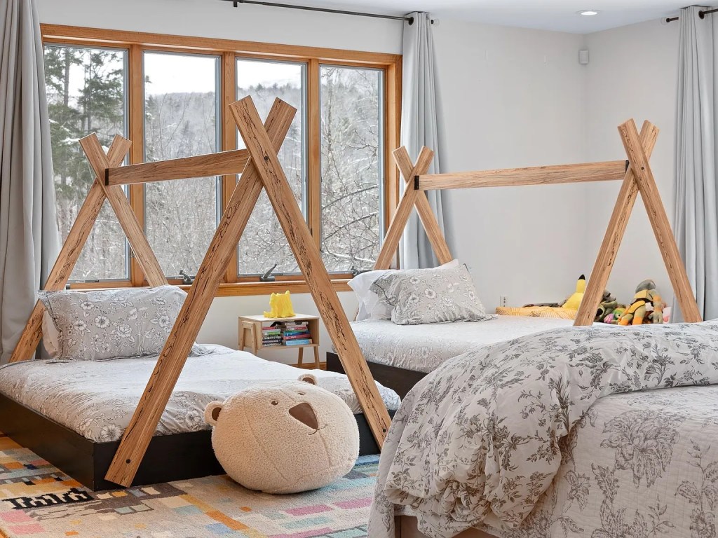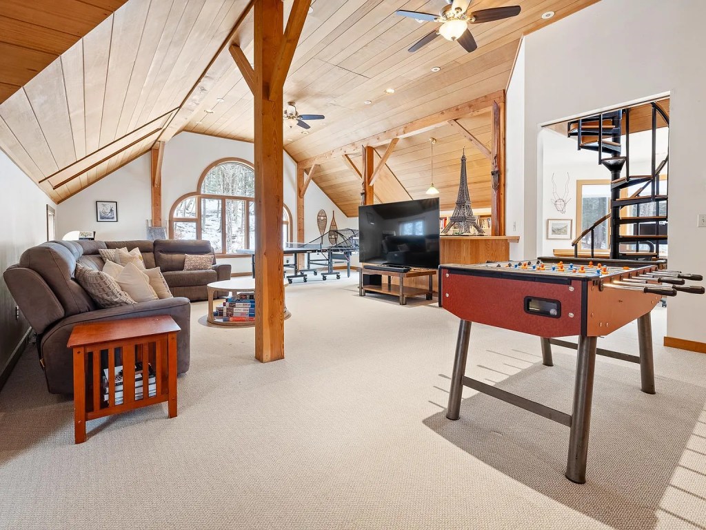 Inspired by classic New England barns, the home’s exterior features wood cladding, steep rooflines, and a timeless silhouette that fits beautifully into the surrounding landscape. Inside, soaring ceilings, exposed beams, and natural materials bring warmth and authenticity, while large windows frame the mountain and river views that define this stunning setting.