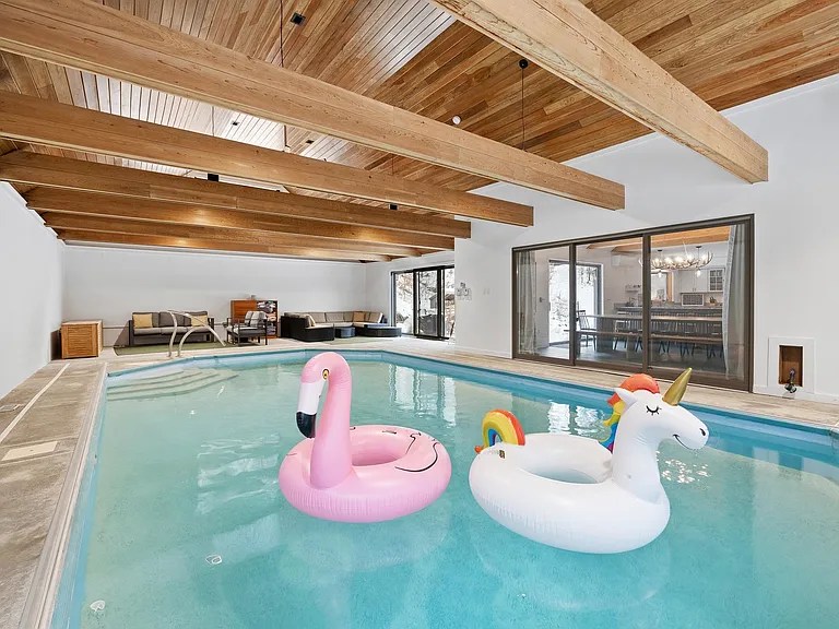 With four bedrooms and three full baths, the home is both expansive and welcoming. But what truly sets All Seasons apart is its connection to the land. The 40-acre property includes private trails for hiking, snowshoeing, and mountain biking, a riverside firepit and patio, and a 32-foot indoor pool that makes year-round enjoyment effortless. A hot tub under the stars, owned riverfront access, and a potential additional homesite with its own mountain view offer long-term possibilities for growth and enjoyment.