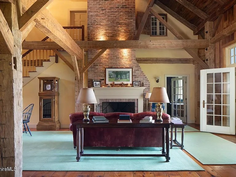 There’s something exhilarating about seeing old farm buildings repurposed in ways that honor their past but serve the present. The timber frame barn conversion on the property might be one of the best examples of adaptive reuse in the Berkshires. A 2.5-story great room with hand-hewn beams and plastered walls forms the soul of the space. Two walnut staircases frame the room like sculpture, rising dramatically to separate bedroom wings.