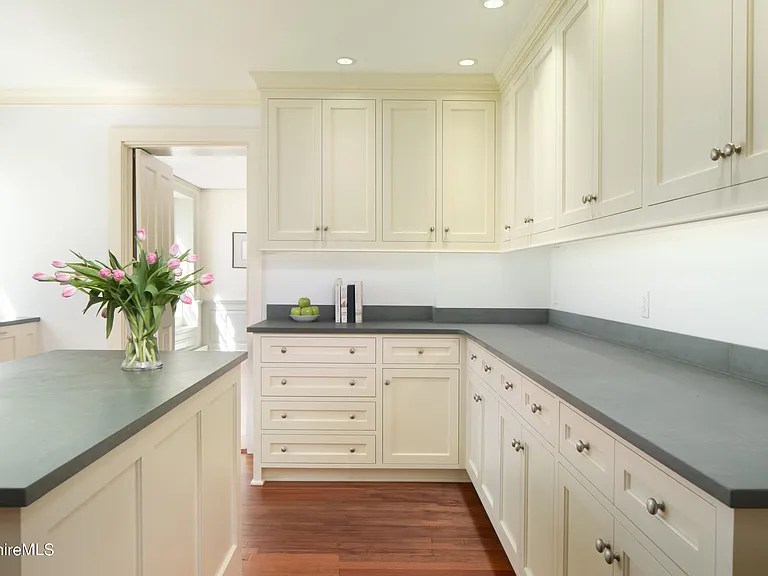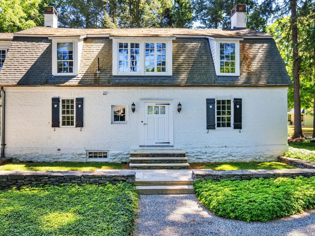 The Dutch Gambrel roof, with its distinctive double slopes, was originally a practical choice, it gave more space upstairs without needing a full second story. But here, it’s so much more than practical. It’s the crown of a house that feels both grounded and grand. With three oversized fireplaces, original wide plank flooring, and a facade flanked by carriage lanterns and heart-cut shutters, the home feels like a historical novel you can walk through.