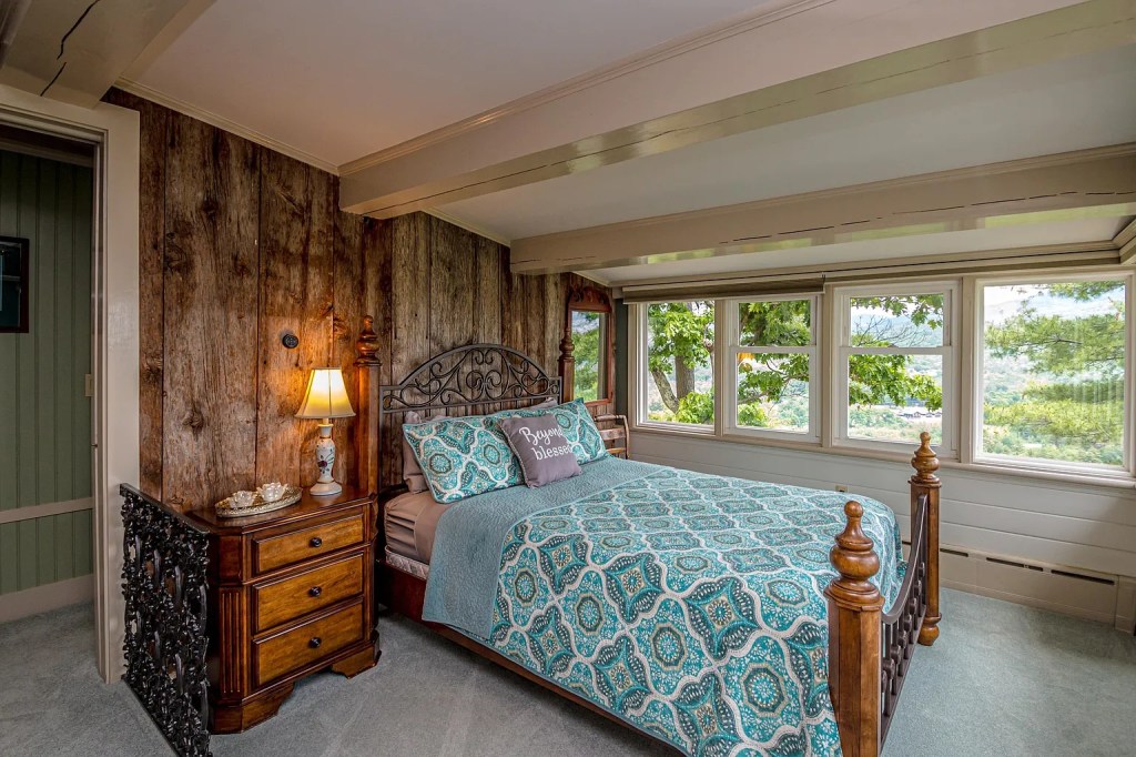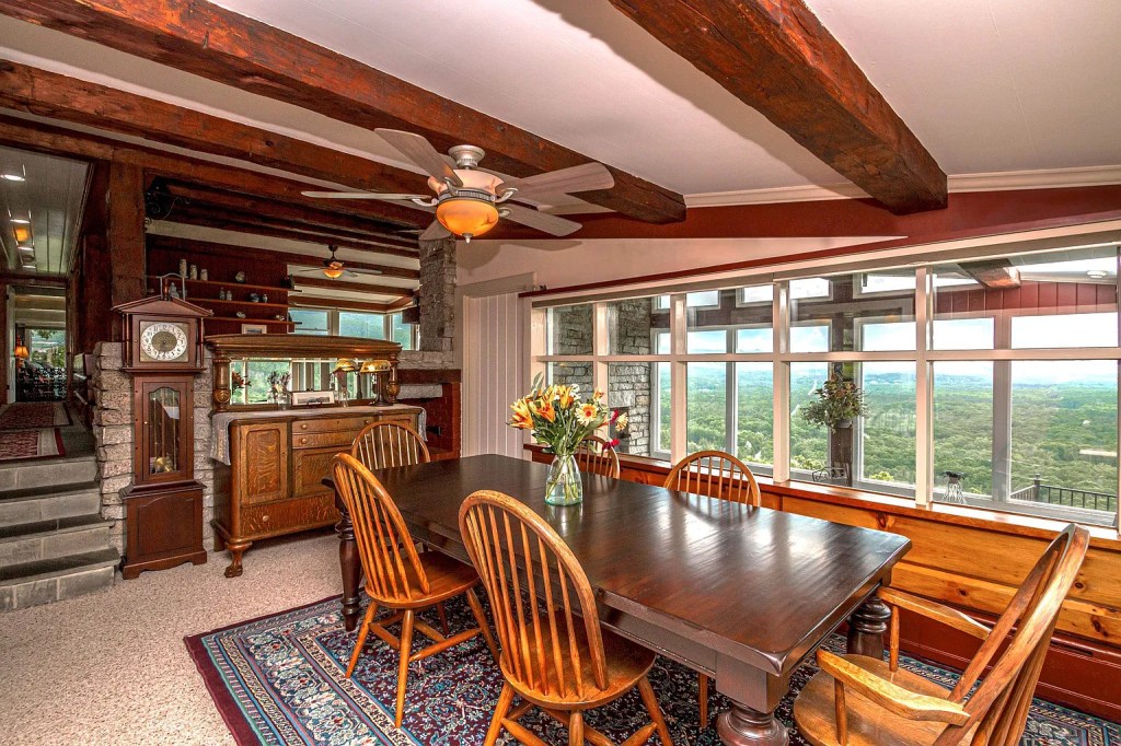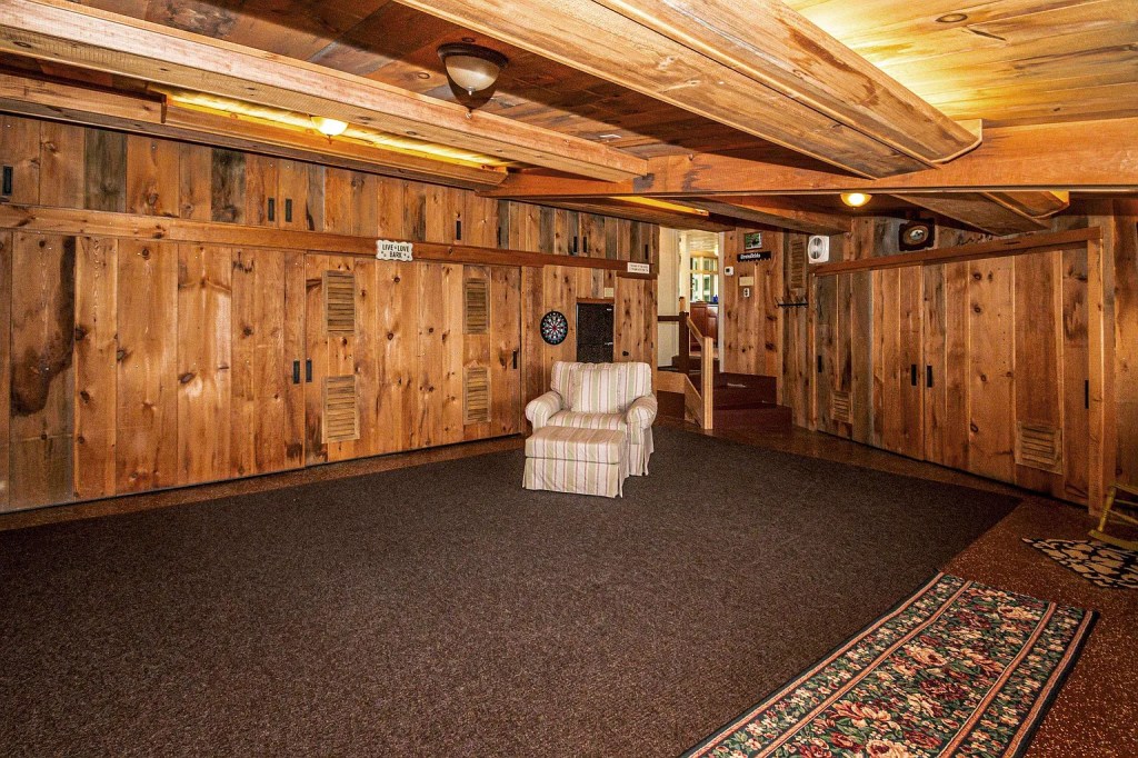 The interior layout is practical but custom, with details that lean rustic without feeling kitschy. Barnboard, granite, slate, and tray ceilings give the home an undeniable sense of personality. The lower-level den, once a poker room, has a granite accent wall, wraparound windows, and a fireplace that centers the space. It’s not a cookie-cutter bonus room; it’s a conversation piece with actual substance.