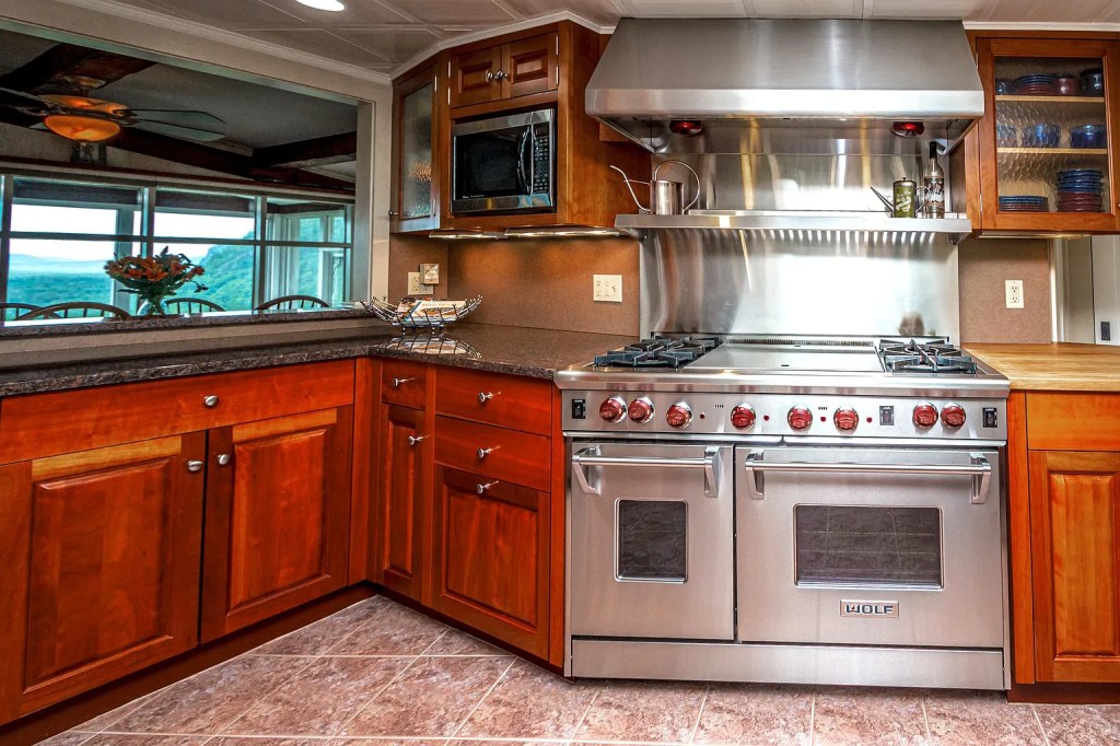 At first glance, the structure’s low roofline, broad overhangs, and strategic use of natural materials clearly nod to Wright’s philosophy of harmonizing with nature. Nearly every window frames a view: the Moat Mountains, Cranmore, Kearsarge, and the valley below all become part of the experience. Even inside, you don’t just see the landscape, you feel it. Light pours into the galley-style kitchen each morning, and you get full daylight exposure in the main living spaces throughout the day, thanks to the home’s smart orientation and abundant glass.